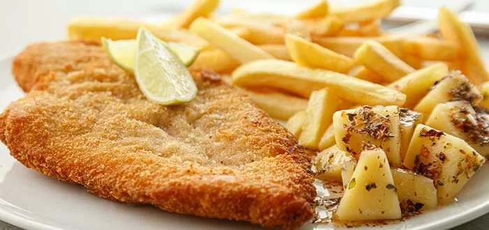 Milanesa de carne con cebolla y queso fundido acompañada de papas.